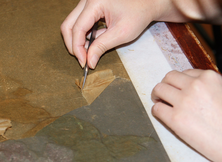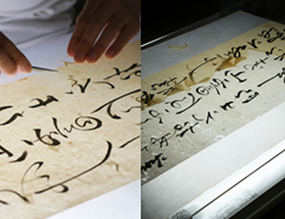 本紙の欠失部分に、似寄りの紙を欠失の形に整えて繕う。