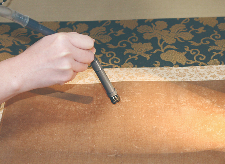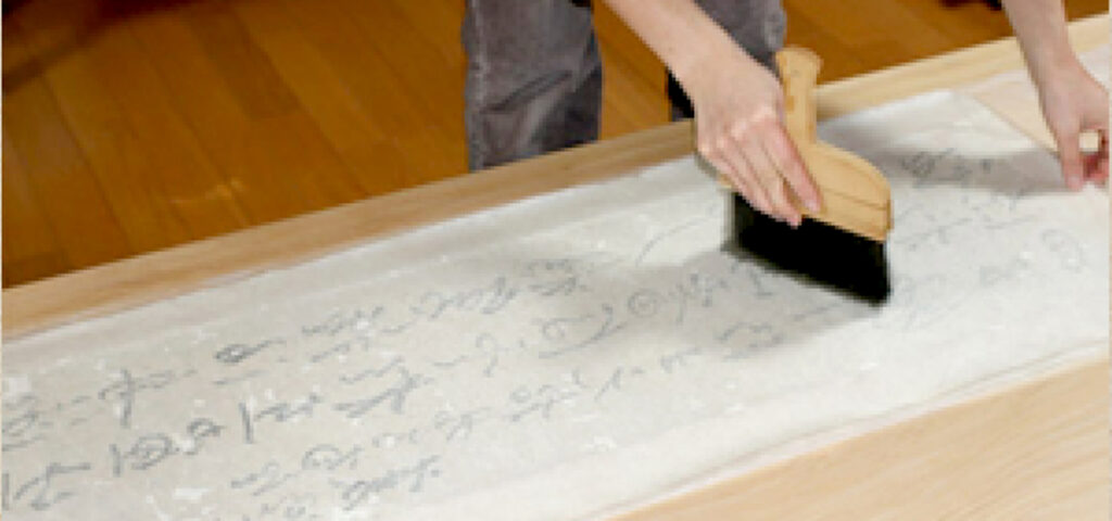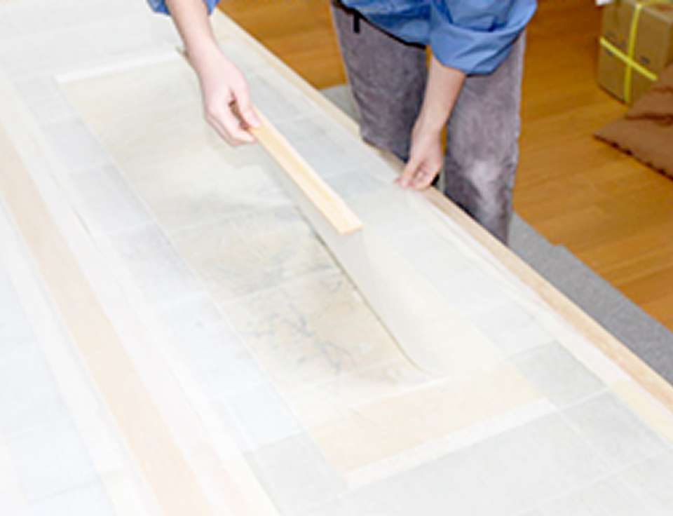 掛軸としての柔らかさを出すために増裏打ちを行う。接着力の弱い古糊を使うため打ち刷毛で打って圧着させる。