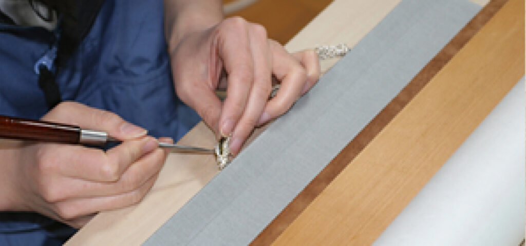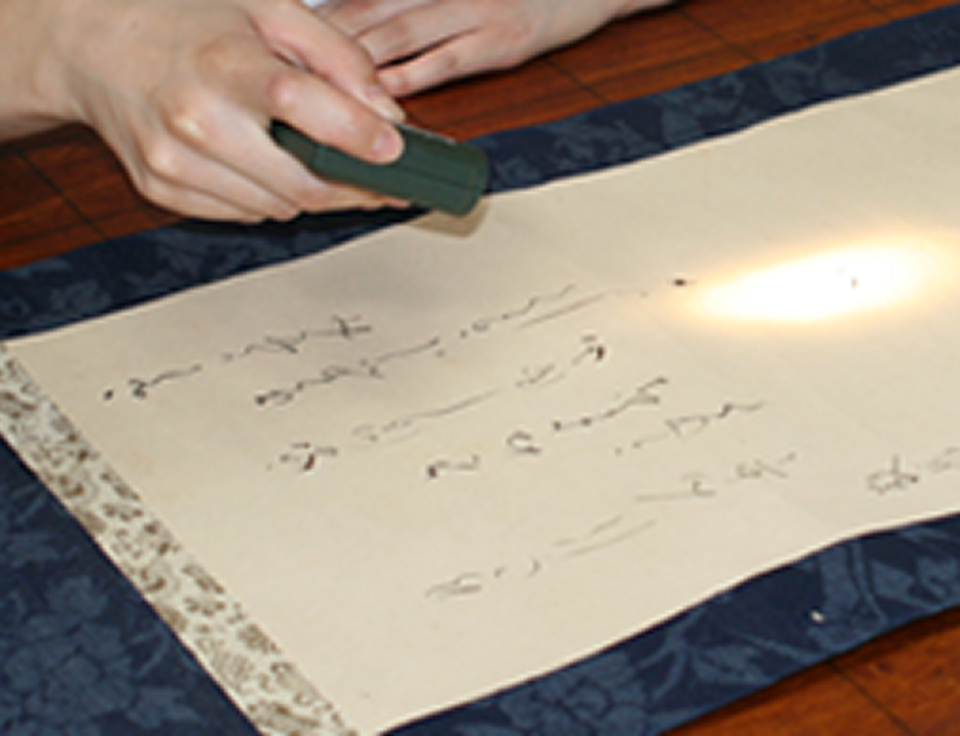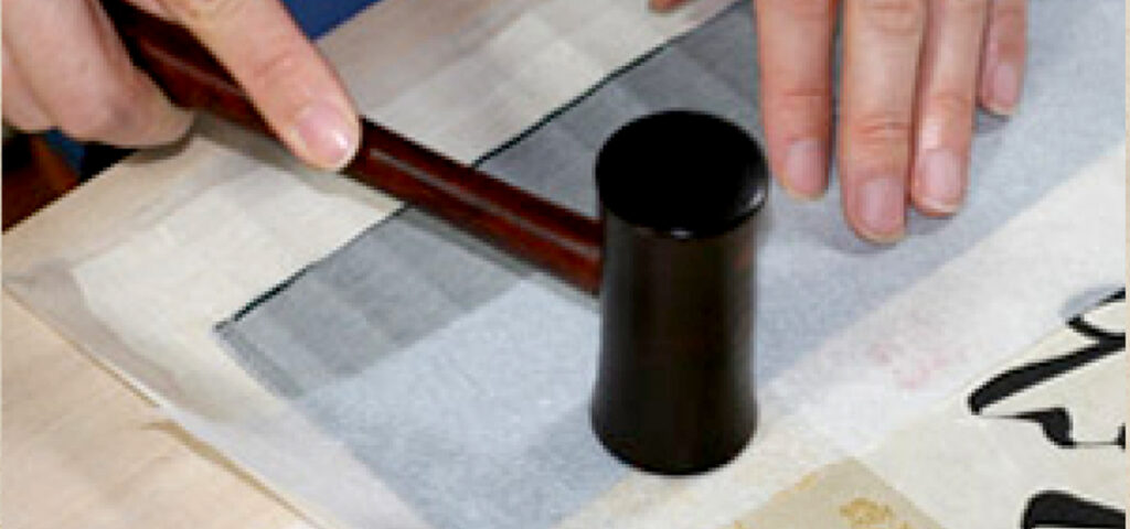 掛軸としての柔らかさと滑りをよくするために数珠で摺る。