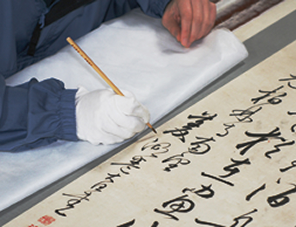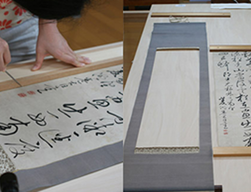 『書』の掛軸は解体修復を行う。表装裂も似た雰囲気の新たな裂に取り替える。