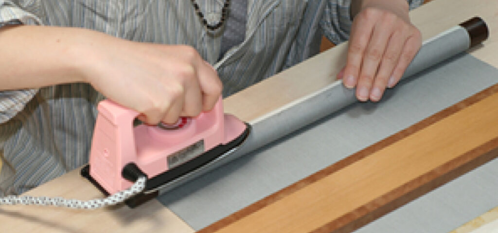 本紙と裂を接合して掛け軸の形にする。
