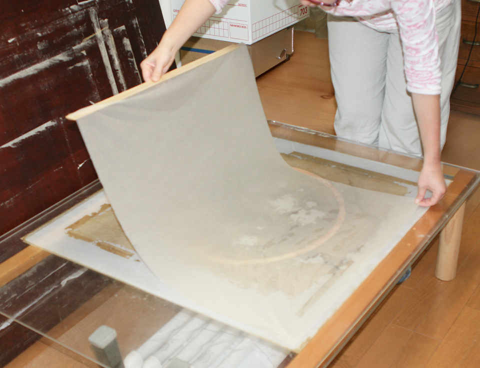 例えば、修復作業の中には、以前の裏打ち紙を剥がす工程があります。この作業ひとつとっても、以前の作業時の精度や材料への配慮が重要になってきます。なぜなら、保管されている間は丈夫でなければなりませんが、修復されるときには綺麗に剥がれなければならないからです。